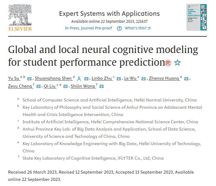 相关成果以“Global and Local Neural Cognitive Modeling for Student Performance Prediction”为题发表在计算机科学大类分区一区期刊Expert Systems with Applications上。该刊为中国科学院大类一区TOP期刊,影响因子为8.665。388vip太阳集团为论文的第一单位,青少年心理健康与危机智能干预安徽省哲学社会科学重点实验室、计算机与人工智能学院苏喻老师为论文第一作者。
