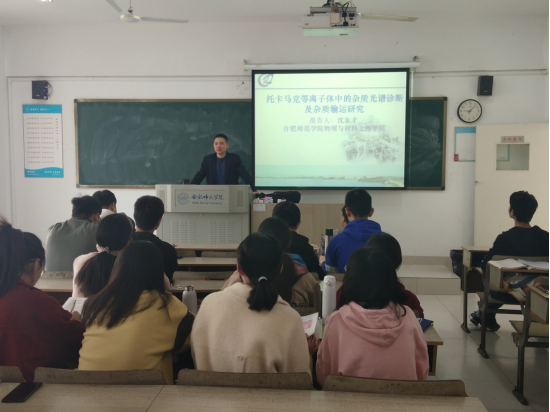 本网讯 10月26日上午,“行知学堂”学术报告在锦绣校区博约楼414举行,本场报告由物理与材料工程学院沈永才老师主讲,主题为“托卡马克等离子体中的杂质光谱诊断及杂质输运研究”,2018级物理学专业学生聆听了学术报告。