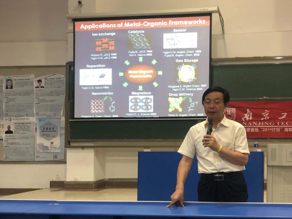 报告中,朱敦如向在座师生介绍了MOFs材料概念、结构特性以及其在光学和磁性材料中的应用,详细阐述了自己的课题组在MOFs材料上的研究设计思路。最后,朱敦如介绍了南京工业大学化工学院的基本情况、先进实验设备、科研实力、硕士研究生的招生领域、招生政策等,并对同学们提出希望。