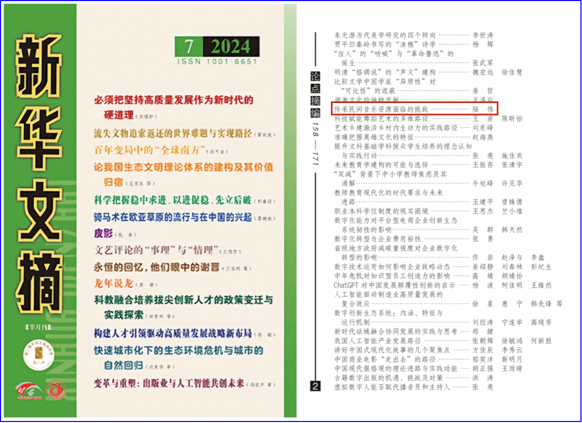 近日,我院音乐学院教师陆伟在《江淮论坛》(2023年第5期)上发表了题为《论中国民间音乐资源的多维价值与创造性转化》的论文,其相关论点被哲学社会科学领域权威期刊《新华文摘》(2024年第7期)摘录。