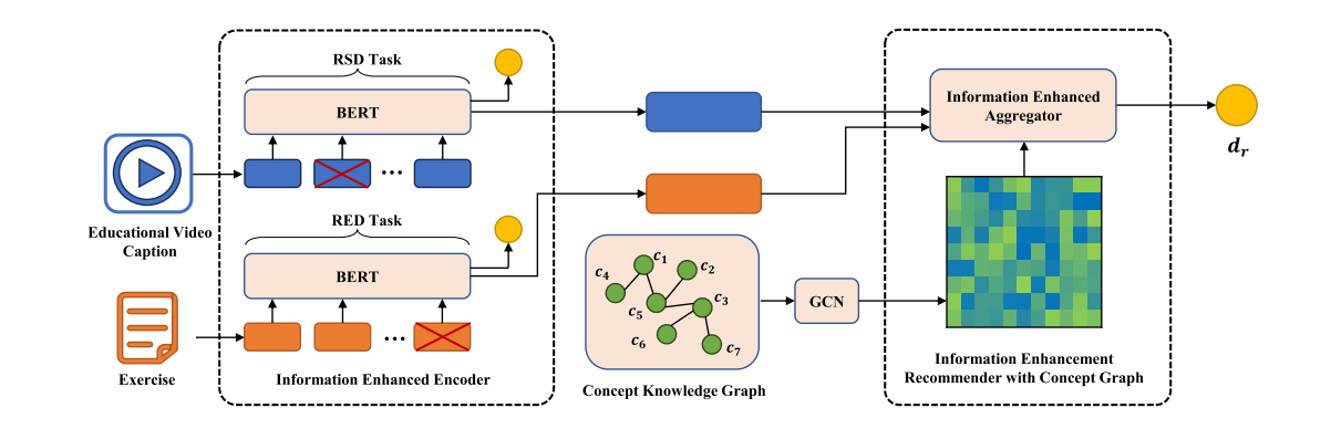 针对上述问题,我院青少年心理健康与危机智能干预安徽省哲学社会科学重点实验室骨干成员苏喻老师提出了一种多任务信息增强推荐(MIER)模型。该模型利用多任务学习技术,能够端对端推荐跨类型的学习资源;同时,该模型提出一个基于注意机制的信息抽取模块,能够有效提取教育资源中的关键语义信息;最后,该模型融合了概念知识图谱,以减轻数据稀疏性的影响,增强模型的鲁棒性和可解释性。实验结果表明,该模型在知识点预测和多类型学习资源推荐任务中超过了现有的最先进方法,对个性化学习系统具有广泛的指导意义。
