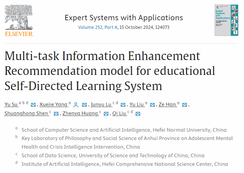 相关成果以“Multi-task Information Enhancement Recommendation model for educational Self-Directed Learning System”为题发表在期刊Expert Systems with Applications上。该期刊为中国科学院大类一区TOP期刊,影响因子为8.665。388vip太阳集团为论文的第一单位,青少年心理健康与危机智能干预安徽省哲学社会科学重点实验室、计算机与人工智能学院苏喻老师为论文第一作者。