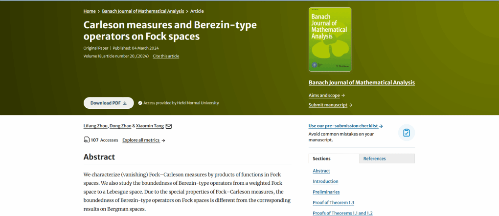 近期,数学与统计学院“基础数学”省级重点学科微分方程与动力系统团队教师周立芳教授在多复变函数论方向取得进展,相关成果Carleson measures and Berezin-type operators on Fock spaces在JCR二区期刊《Banach Journal of Mathematical Analysis 》公开发表。