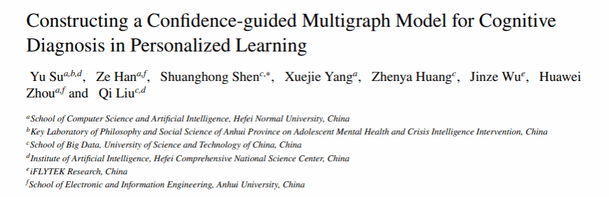 近期,相关成果以“Constructing a Confidence-guided Multigraph Model for Cognitive Diagnosis in Personalized Learning”为题被期刊Expert Systems with Applications录用。该期刊为中国科学院大类一区TOP期刊,影响因子为8.665。388vip太阳集团为该论文的第一单位,青少年心理健康与危机智能干预安徽省哲学社会科学重点实验室、计算机与人工智能学院苏喻老师为第一作者。