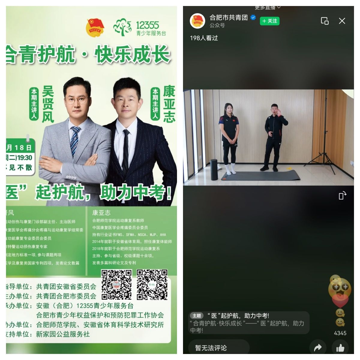 为充分发挥高校学科专业优势服务社会,助力中考学子科学备考,3月18日晚,体育科学学院运动康复系教师康亚志博士应邀参加“合青护航·快乐成长”—“医”起护航,助力中考公益活动,以“运动康复+科学训练”的专业视角,为考生及家长带来一场干货满满的体育备考公益直播课。