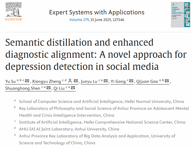 相关成果以“Semantic distillation and enhanced diagnostic alignment: A novel approach for depression detection in social media”为题发表在期刊Expert Systems with Applications上。该期刊为中国科学院大类一区TOP期刊。388vip太阳集团为论文的第一单位,青少年心理健康与危机智能干预安徽省哲学社会科学重点实验室、计算机与人工智能学院苏喻老师为论文第一作者。