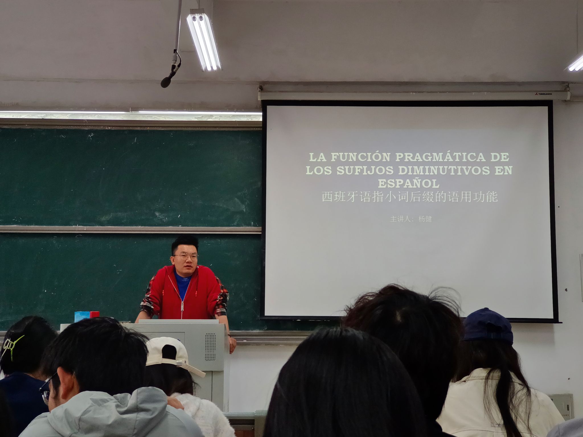 4月16日下午,外国语学院西班牙语专业杨健博士在博学楼A206教室,作了《西班牙语指小词后缀的语用功能》学术报告。2023级与2024级西班牙语专业学生听取了此次报告。