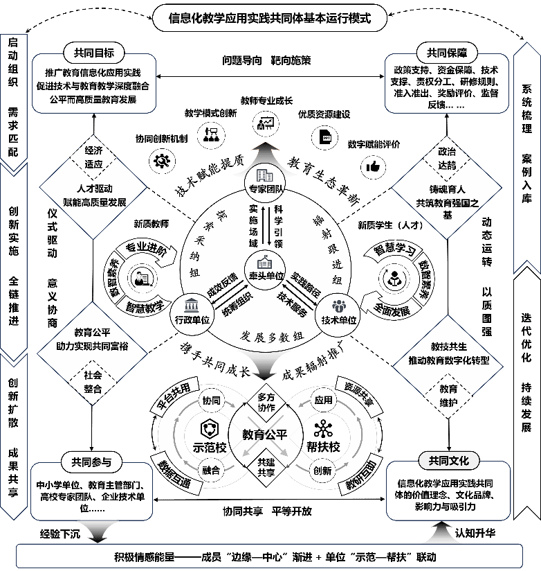 该研究聚焦2024年教育部验收的信息化教学应用实践共同体项目,系统梳理其项目成果,旨在探索教育数字化转型背景下信息化教学应用实践共同体的可持续发展路径。研究创新性地融合“活动理论—互动仪式链—创新扩散理论”构建复合型学理分析框架,深入解析了共同体的本质内涵、时代价值、运行逻辑、创新成果与发展路径,实现了对共同体运行模式与实践机制的双重逻辑阐释。