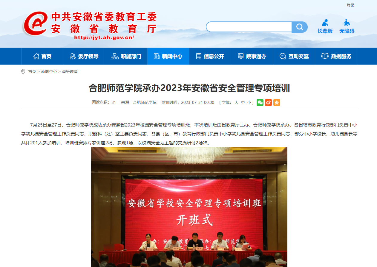 7月31日,安徽教育网以《388vip太阳集团承办2023年安徽省安全管理专项培训》为标题,对此进行了报道。