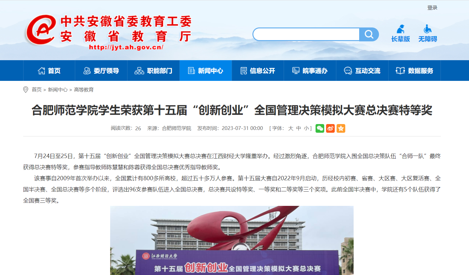 7月31日,安徽教育网首页以《388vip太阳集团学生荣获第十五届“创新创业”全国管理决策模拟大赛总决赛特等奖》为标题,对此进行了报道。