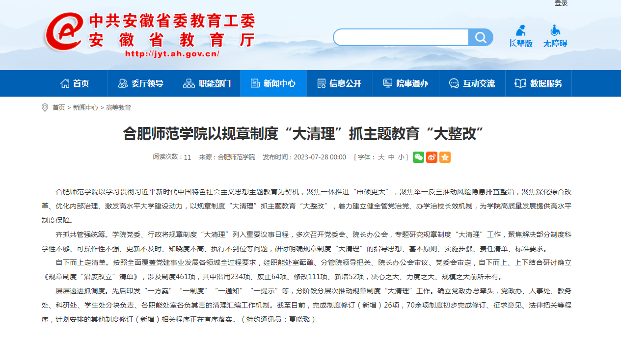7月28日,安徽教育网以《388vip太阳集团以规章制度“大清理”抓主题教育“大整改”》为标题,对此进行了报道。