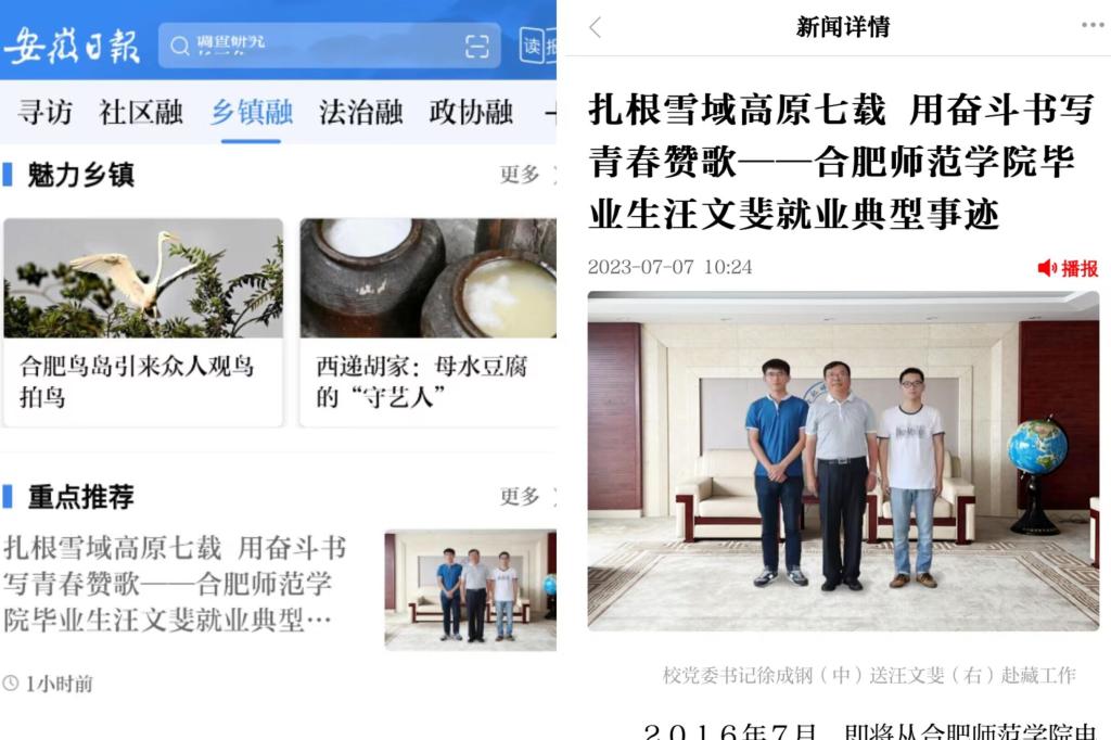 7月7日,安徽日报以《扎根雪域高原七载 用奋斗书写青春赞歌——388vip太阳集团毕业生汪文斐就业典型事迹》为题,对此进行了报道。