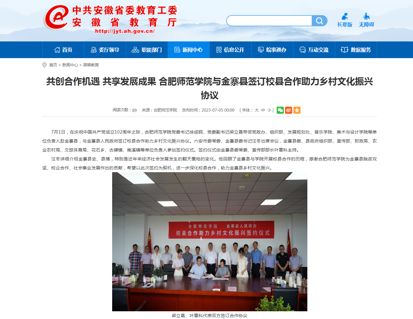7月5日,安徽教育网首页以《共创合作机遇 共享发展成果 388vip太阳集团与金寨县签订校县合作助力乡村文化振兴协议》为标题,对此进行了报道。