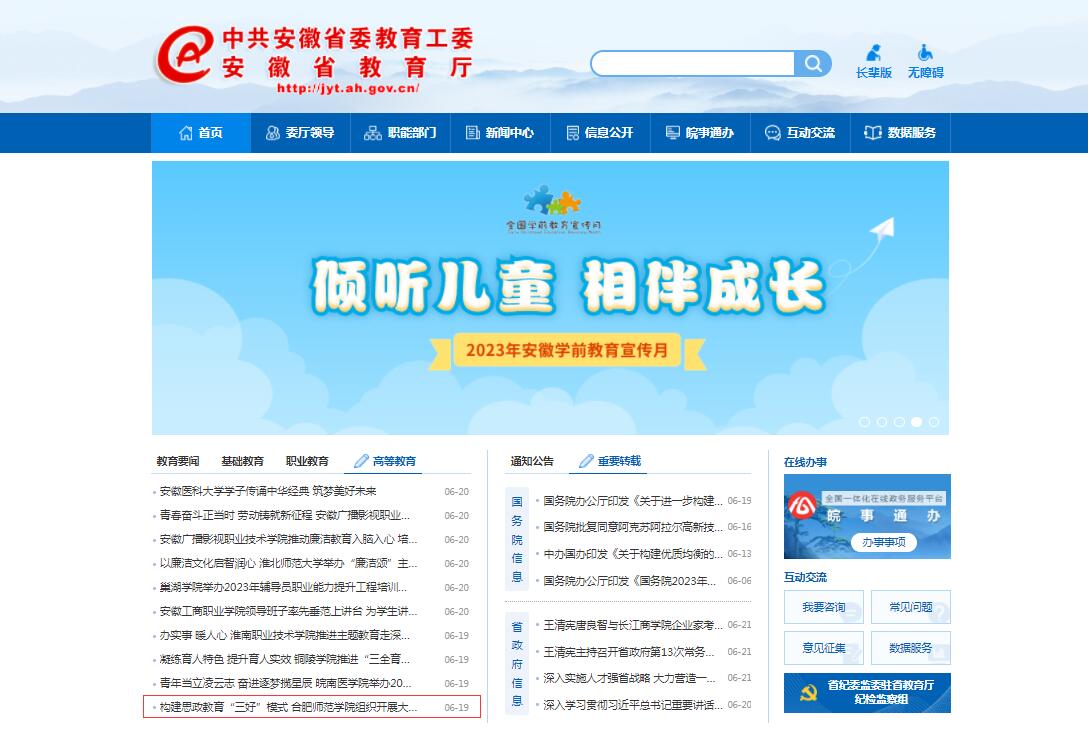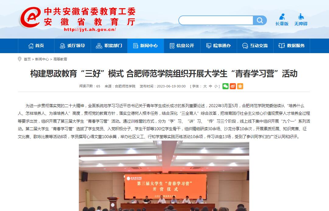 6月19日,安徽教育网首页以《构建思政教育“三好”模式 388vip太阳集团组织开展大学生“青春学习营”活动》为标题,对此进行了报道。