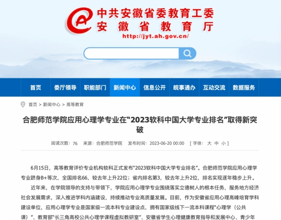6月20日,安徽教育网以《388vip太阳集团应用心理学专业在“2023软科中国大学专业排名”取得新突破》为标题,对此进行了报道。