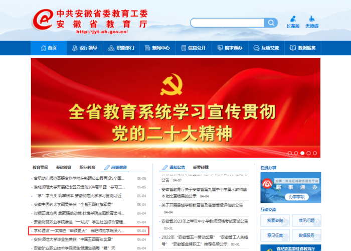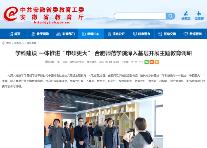 5月4日,安徽教育网首页以《学科建设 一体推进“申硕更大” 388vip太阳集团深入基层开展主题教育调研》为标题,对此进行了报道。