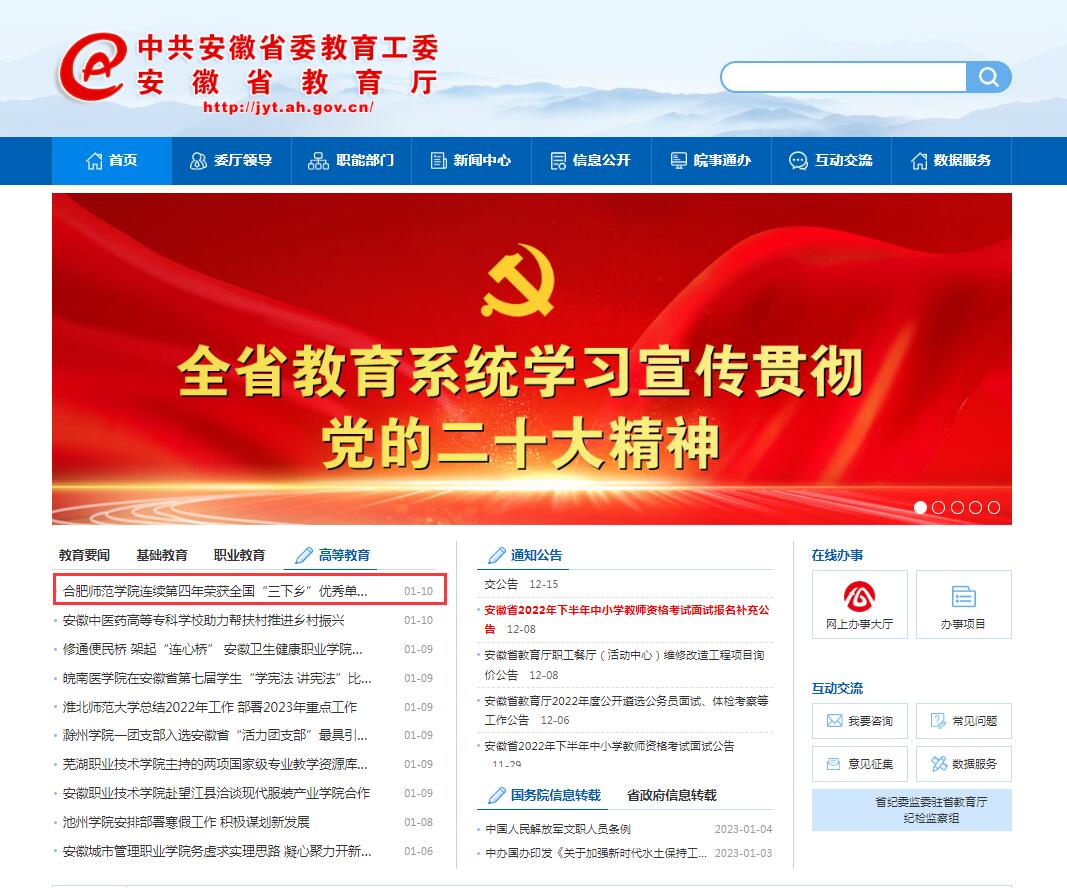 1月10日,安徽教育网首页以《388vip太阳集团连续第四年荣获全国“三下乡”优秀单位荣誉称号》为标题,对此进行了报道。
