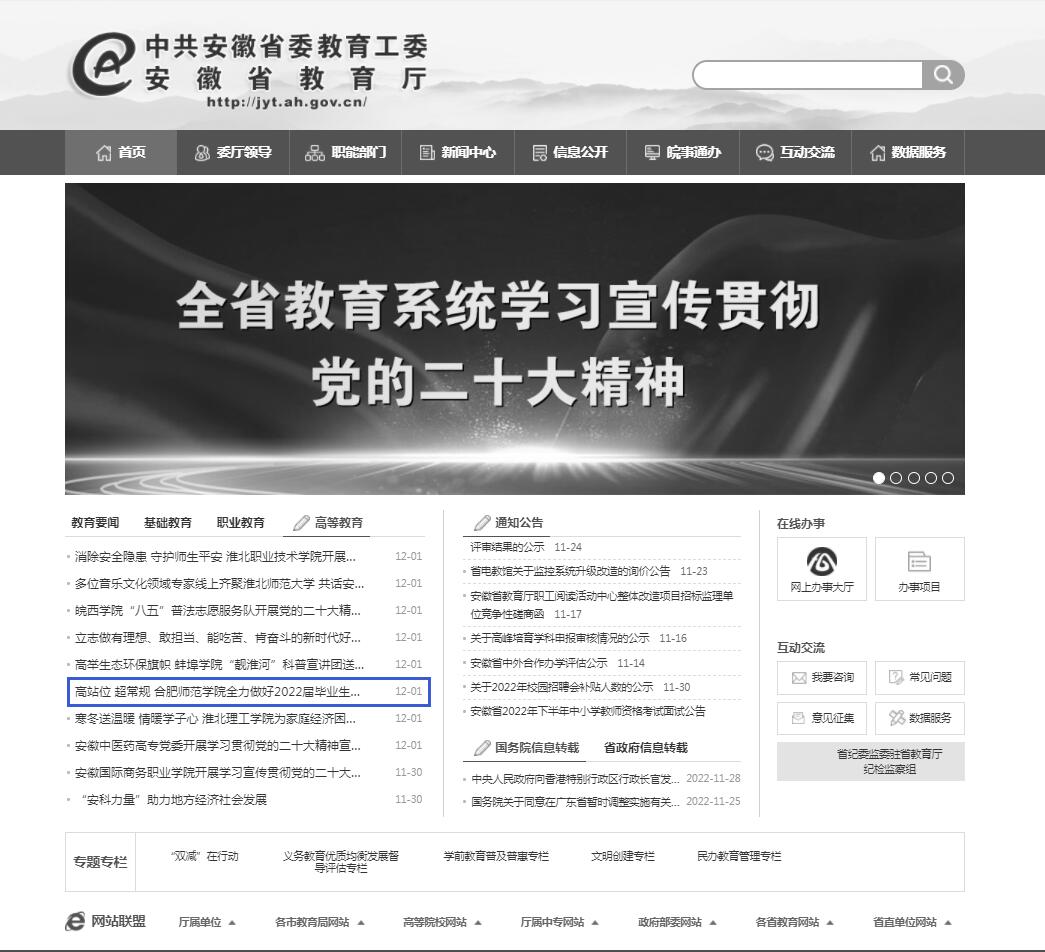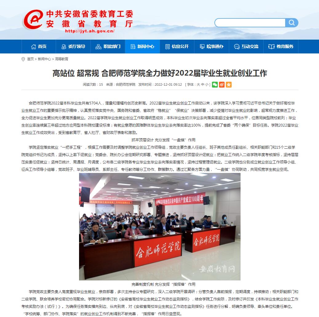 12月1日,安徽教育网首页以《高站位 超常规 388vip太阳集团全力做好2022届毕业生就业创业工作》为标题,对此进行了报道。