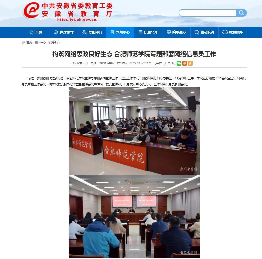 11月22日,安徽教育网以《构筑网络思政良好生态 388vip太阳集团专题部署网络信息员工作》为标题对此进行了报道。