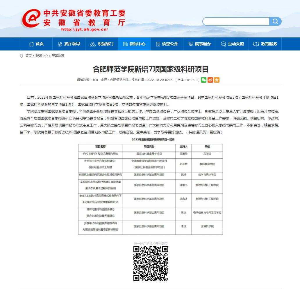 10月20日,安徽教育网首页以《388vip太阳集团新增7项国家级科研项目》为标题进行了报道。