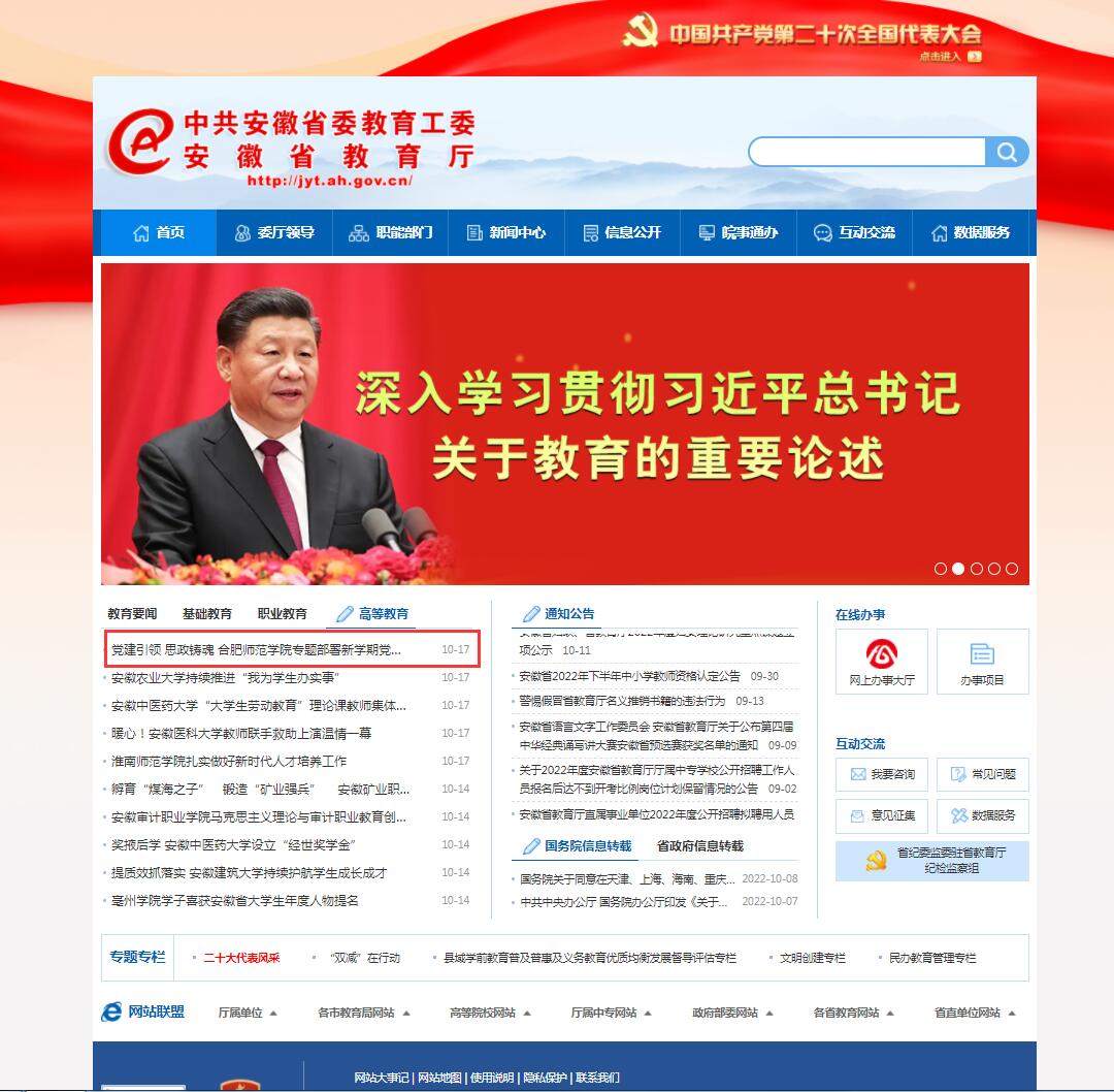 10月17日,安徽教育网首页以《党建引领 思政铸魂 388vip太阳集团专题部署新学期党建与思政工作》为标题进行了报道。