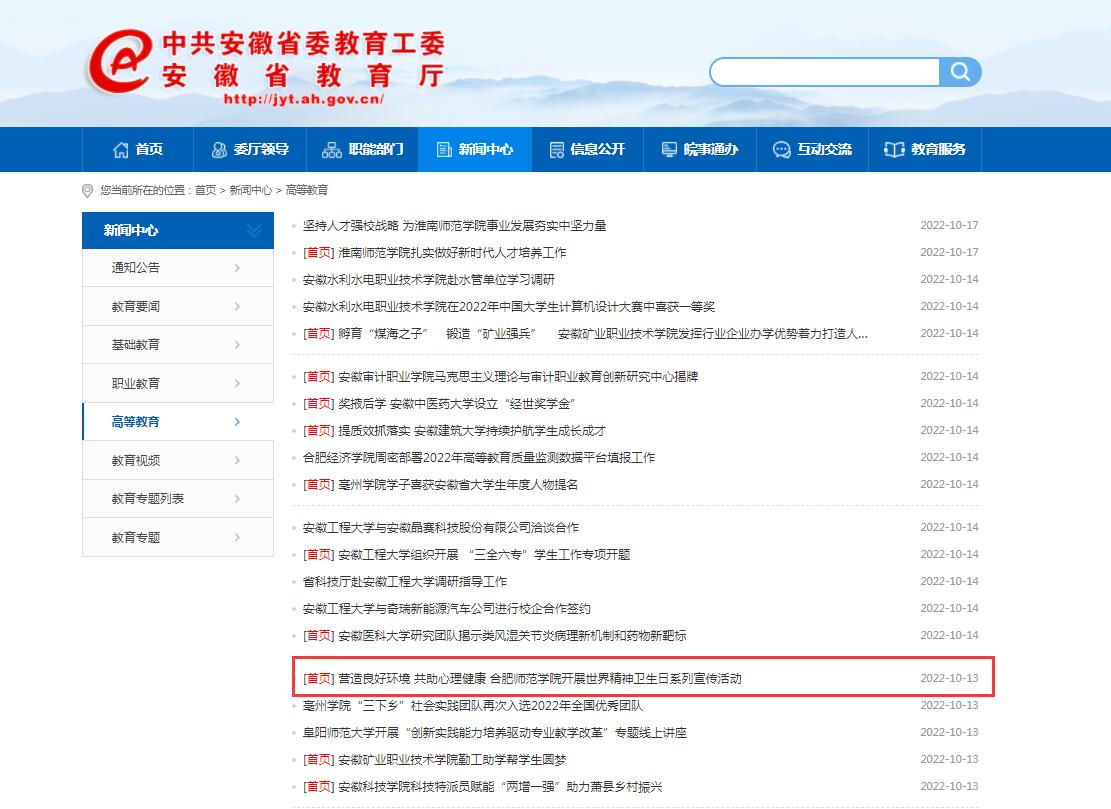 10月13日,安徽教育网首页以《营造良好环境 共助心理健康 388vip太阳集团开展世界精神卫生日系列宣传活动》为标题进行了报道。