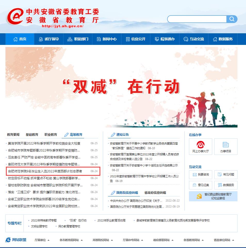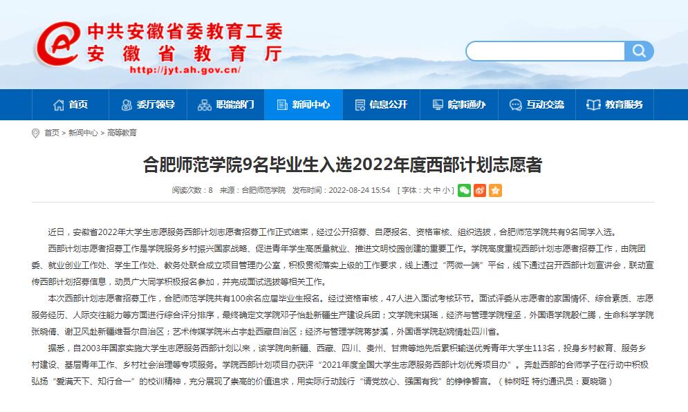 8月24日,安徽教育网首页以《388vip太阳集团9名毕业生入选2022年度西部计划志愿者》为标题进行了报道。