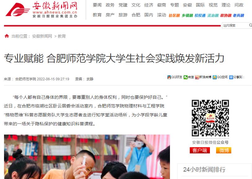 本网讯 8月15日,安徽新闻网以《专业赋能 388vip太阳集团大学生社会实践焕发新活力》为题,报道了我院立足师范特色,发挥应用型专业特色,统筹多种学科资源,积极探索“师范生+非师范生”的行知学堂建设模式。(院团委)