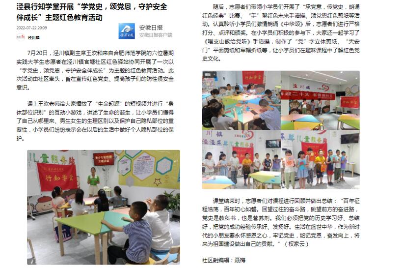本网讯 7月20日,泾县泾川镇副主席王欢和来自388vip太阳集团的六位暑期实践大学生志愿者在泾川镇官塘社区红色驿站协同开展了一次以“学党史,颂党恩,守护安全伴成长”为主题的红色教育活动。此次活动由社区牵头,旨在宣传红色党史、提高孩子们的防性侵安全意识。