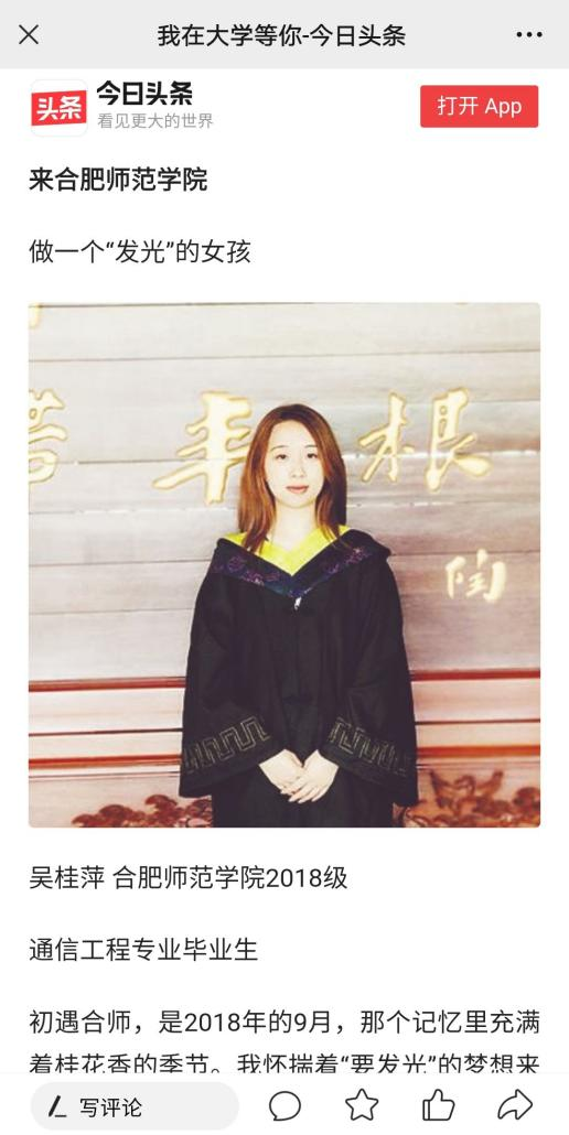 本网讯 近日,为充分发挥优秀大学生的示范带头作用,展示大学生青春力量,《安徽青年报》、安青网在招生季特别策划了“我在大学等你”专题报道活动。其中,《做一个“发光”的女孩》报道了电子信息与电气工程学院2018级通讯工程专业毕业生吴桂萍同学的先进事迹。(电子信息与电气工程学院)