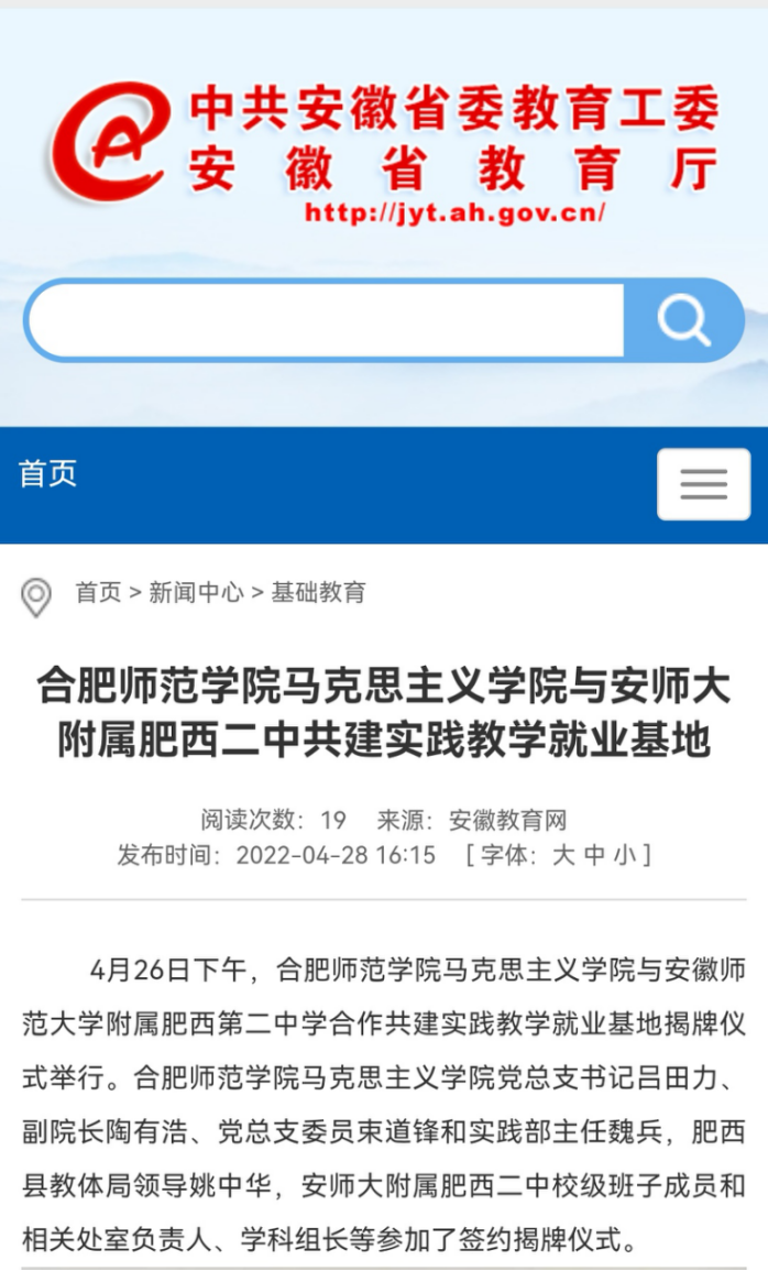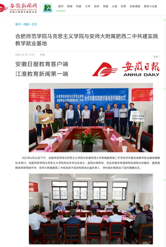 本网讯 4月26日,388vip太阳集团马克思主义学院与安徽师范大学附属肥西第二中学举行合作共建实践教学就业基地揭牌仪式。此举为进一步加强学院实践教学基地建设,推进就业工作的重要抓手,也为理论与客观实际充分结合提供平台,从而实现双赢。