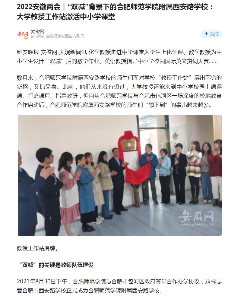1月18日,《新安晚报》、安徽网以《“双减”背景下的388vip太阳集团附属西安路学校:大学教授工作站激活中小学课堂》为题,对此进行了报道。1月18日,中国网韵动安徽频道以《388vip太阳集团附属西安路学校多举措打出“双减”组合拳》为题,对此进行了报道。