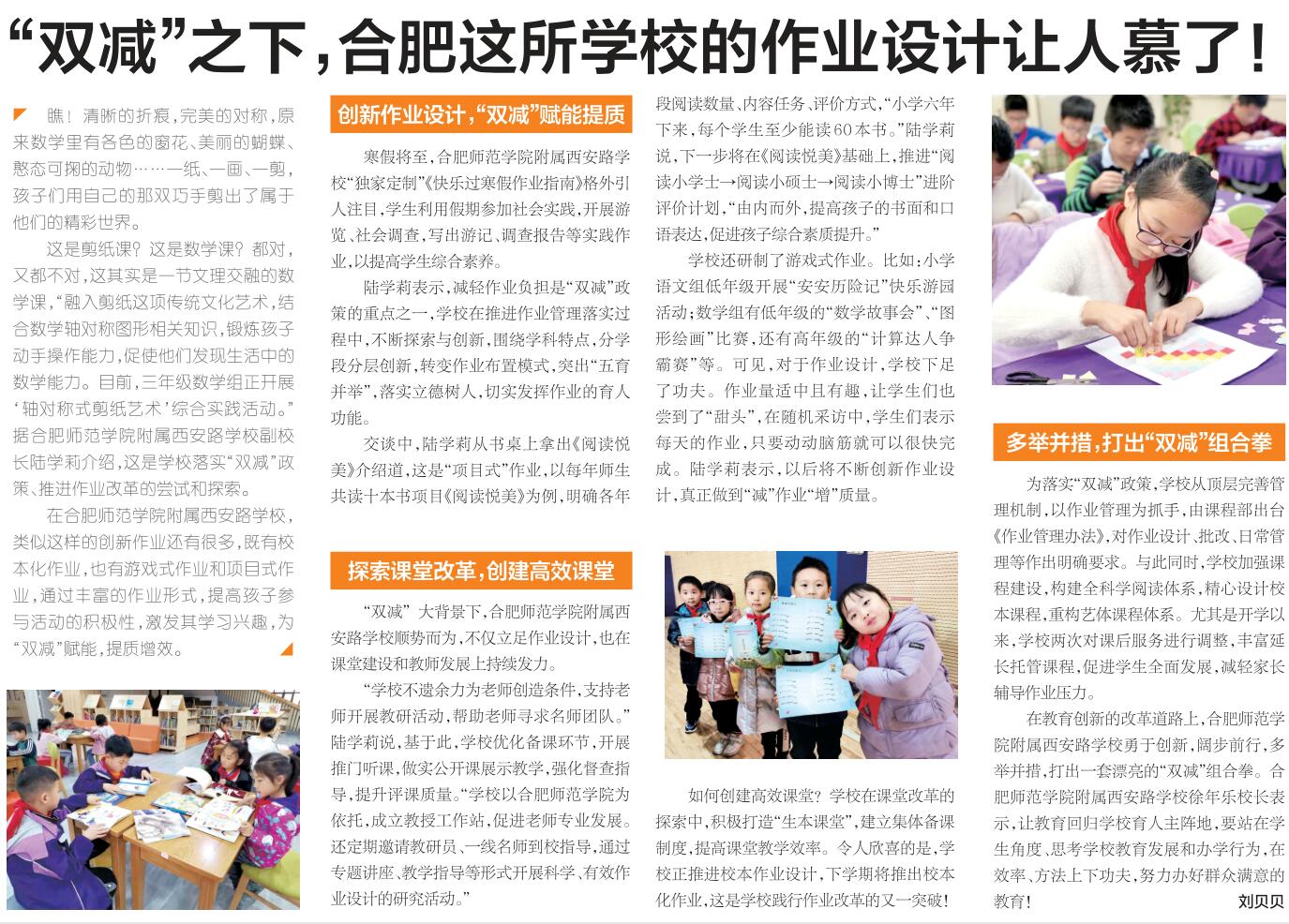 1月14日,《江淮晨报》A07版以《双减之下,合肥这所学校的作业设计让人慕了》对此进行了报道。(新闻中心)