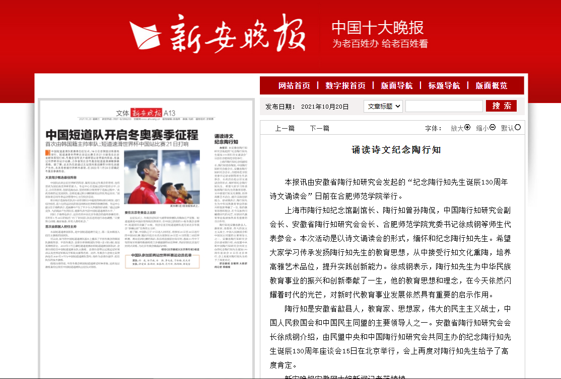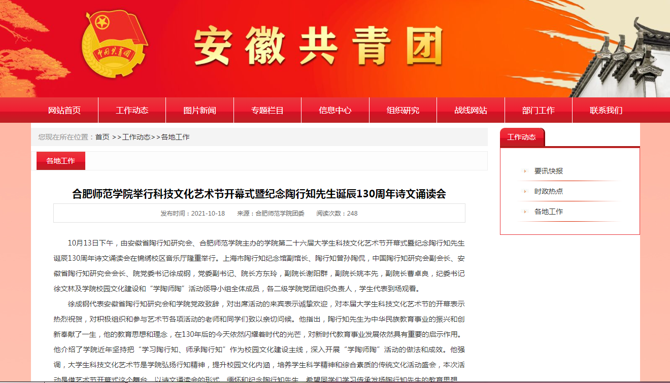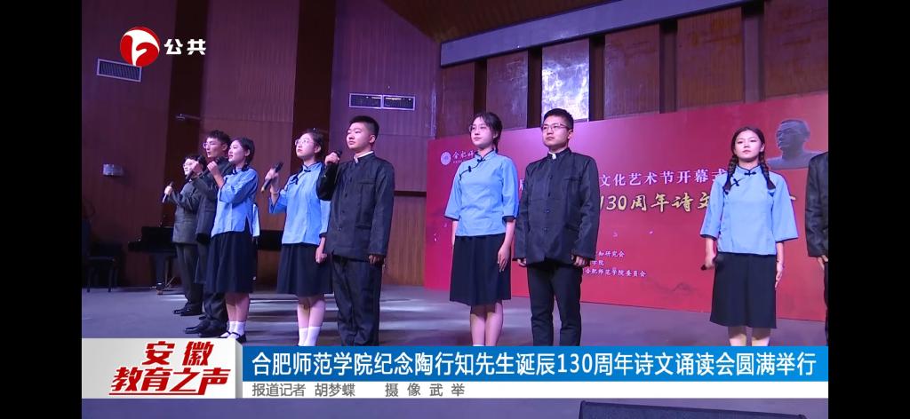 本网讯 10月13日下午,由安徽省陶行知研究会、388vip太阳集团主办的院第二十六届大学生科技文化艺术节开幕式暨纪念陶行知先生诞辰130周年诗文诵读会在锦绣校区音乐厅隆重举行。安徽电视台公共频道、《新安晚报》、安徽网、安徽教育网、安徽共青团网等媒体对此进行了报道。安徽电视台公共频道还采访了来院参加活动的上海陶行知纪念馆副馆长、陶行知曾孙陶侃和安徽省陶行知研究会会长、我院党委书记徐成钢。(省陶研会、院团委)