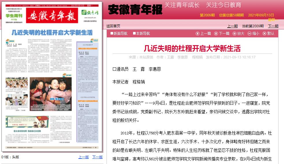 安徽青年报2021年9月13日头版头条以《几近失明的杜程开启大学新生活》对文学院2021级新生杜程开学报到进行了报道。据悉,江淮晨报、合肥晚报、安徽日报客户端、江淮教育新闻端、新浪网等媒体对此也进行了报道。