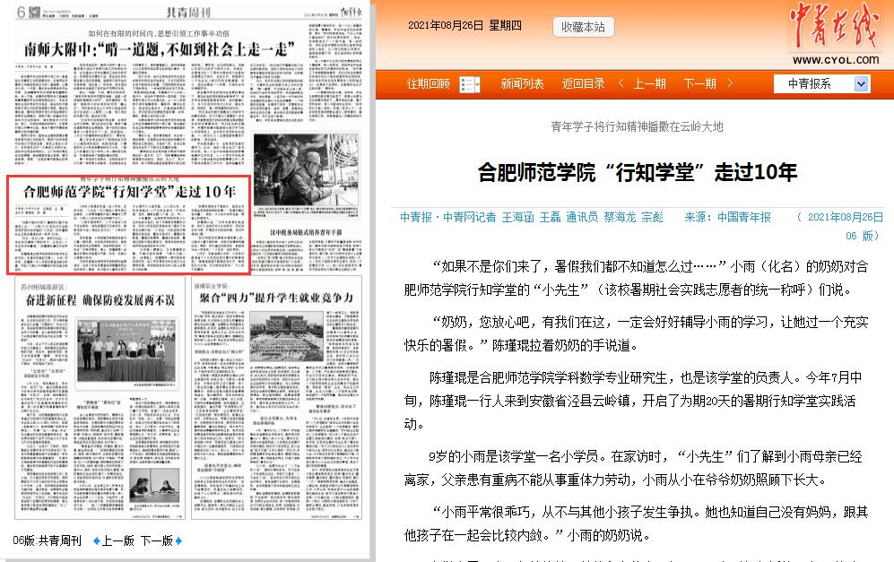 中国青年报2021年8月26日(06版)以《青年学子将行知精神播撒在云岭大地——388vip太阳集团“行知学堂”走过10年》为题,对此进行了专题报道,这是中国青年报连续第三年报道“行知学堂”实践活动。(院团委)