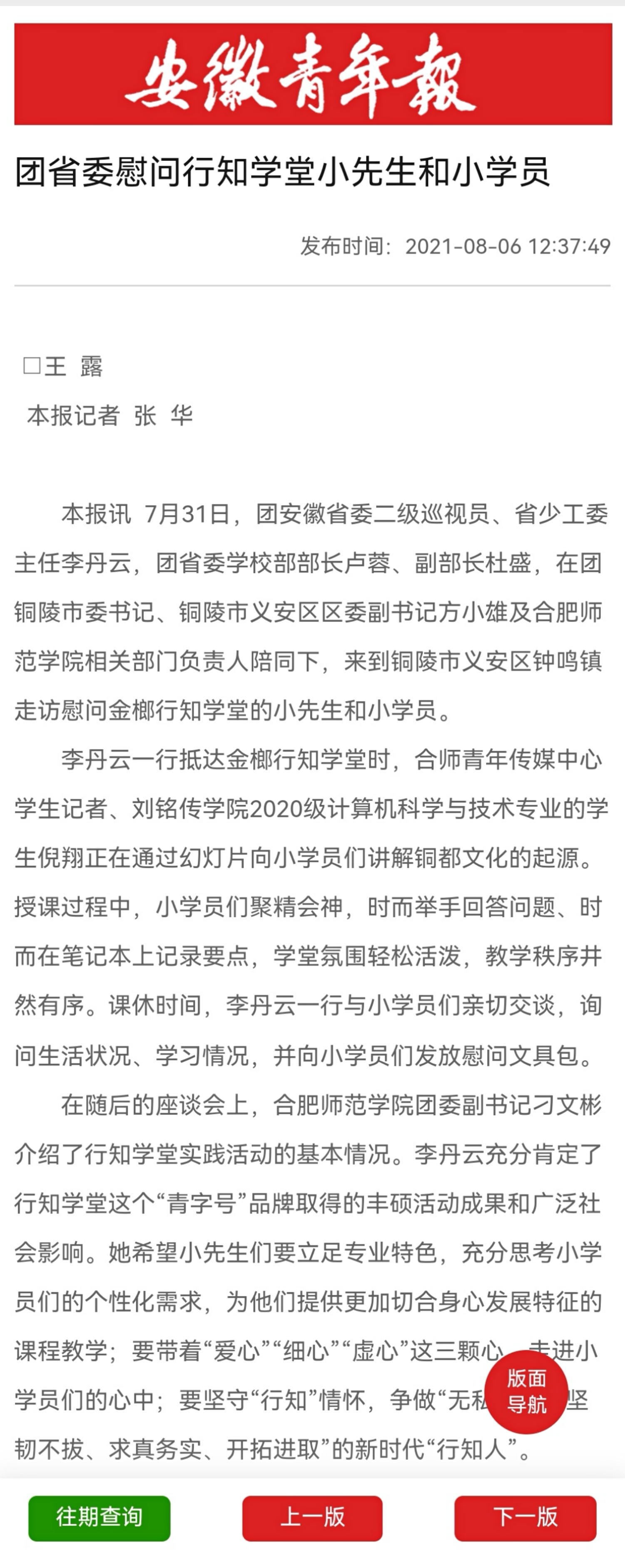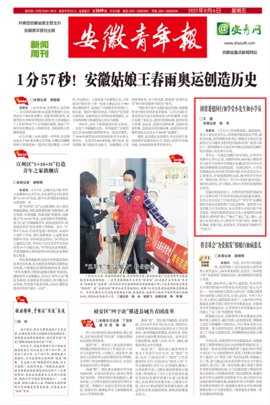 8月6日,安徽青年报头版对此进行报道。(院团委:王露)