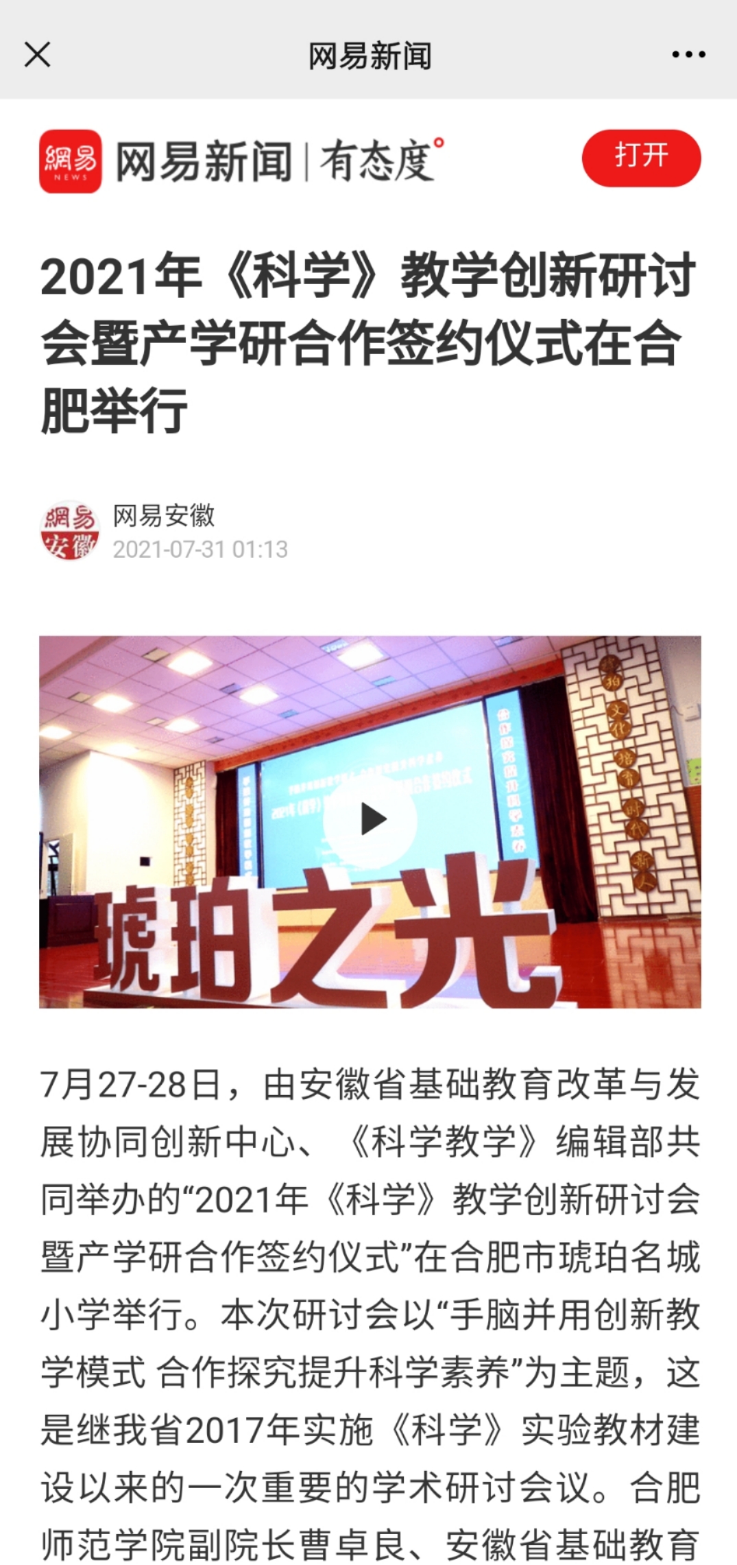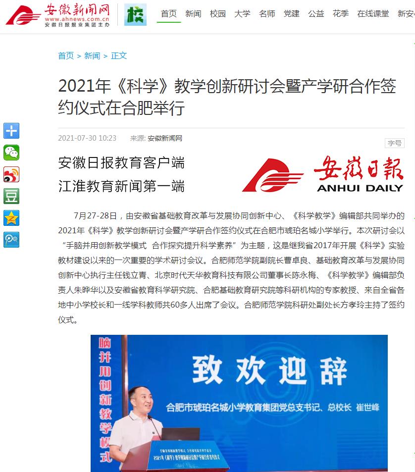 本网讯 7月27-28日,由安徽省基础教育改革与发展协同创新中心、《科学教学》编辑部共同举办的2021年《科学》教学创新研讨会暨产学研合作签约仪式在合肥市琥珀名城小学举行。本次研讨会以“手脑并用创新教学模式合作探究提升科学素养”为主题,这是继2017年开展《科学》实验教材建设以来的一次重要的学术研讨交流活动。388vip太阳集团党委委员、副院长曹卓良,北京时代天华教育科技有限公司董事长陈永梅,总经理朱晔华以及安徽省教育科学研究院、合肥基础教育研究院、《科学教学》编辑部等科研机构的专家教授、来自全省各地中小学校长和一线学科教师共60多人出席了会议。388vip太阳集团科研处副处长方孝玲主持了签约仪式。