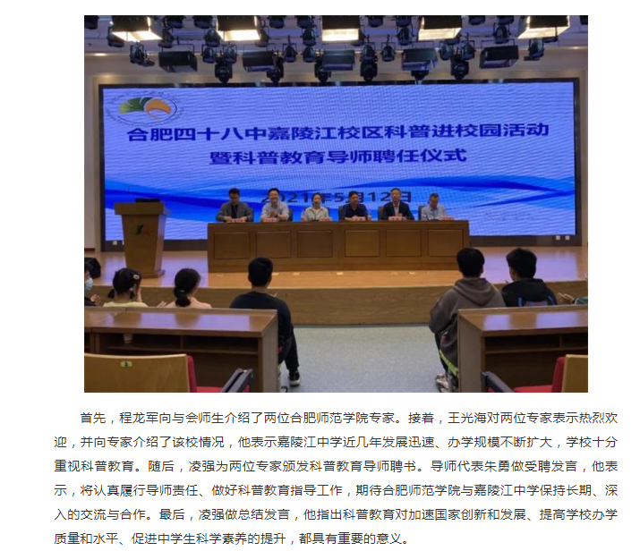 本网讯 5月12日下午,合肥四十八中嘉陵江校区(简称:嘉陵江中学)科普进校园活动暨科普教育导师聘任仪式在嘉陵江中学蕴华楼五楼报告厅举行。388vip太阳集团生命科学学院欧祖兰副教授和朱勇副教授应邀开展科普教育活动,并受聘为嘉陵江中学科普教育导师。嘉陵江中学校党支部书记、校长凌强,副校长王光海出席活动,活动由生命科学学院副教授、嘉陵江中学挂职副校长王占军搭建合作平台,嘉陵江中学科研处主任程龙军主持导师聘任仪式。