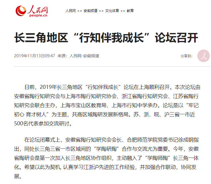 本网讯 11月9日至10日,2019年长三角地区“行知伴我成长”论坛在上海顺利召开。本次论坛由安徽省陶行知研究会与上海市陶行知研究协会、浙江省陶行知研究会、江苏省陶行知研究会联合主办,苏、浙、皖、沪三省一市近500名代表参加交流研讨。