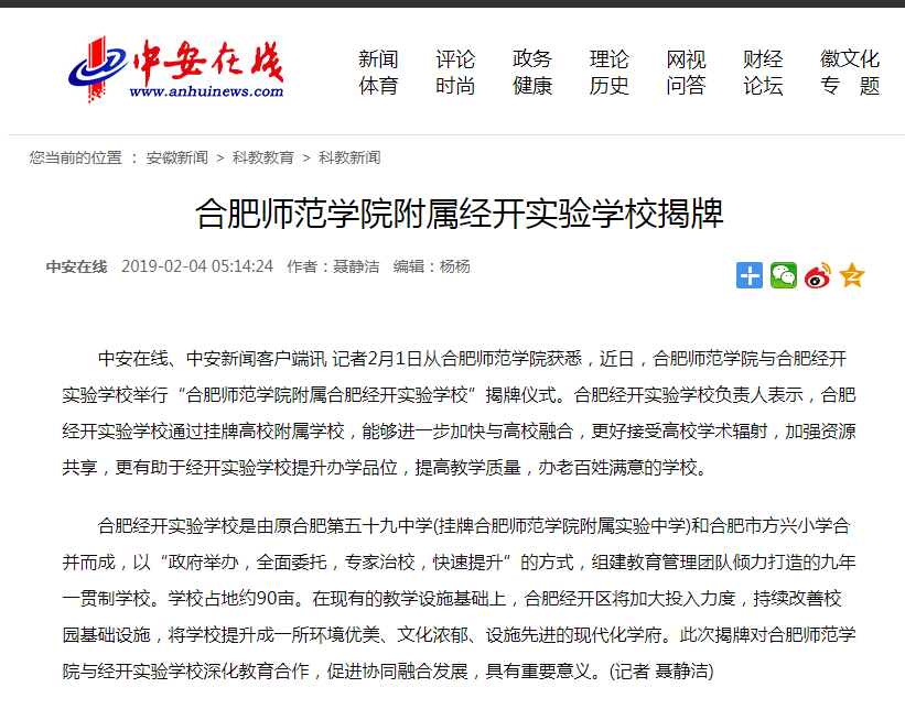 本网讯 1月22日,我院与合肥经开实验学校举行了“388vip太阳集团附属合肥经开实验学校”揭牌仪式。2月4日中安在线进行了报道,2月6日合肥市门户网站转载合肥晚报进行了报道。(特约通讯员:胡石清)