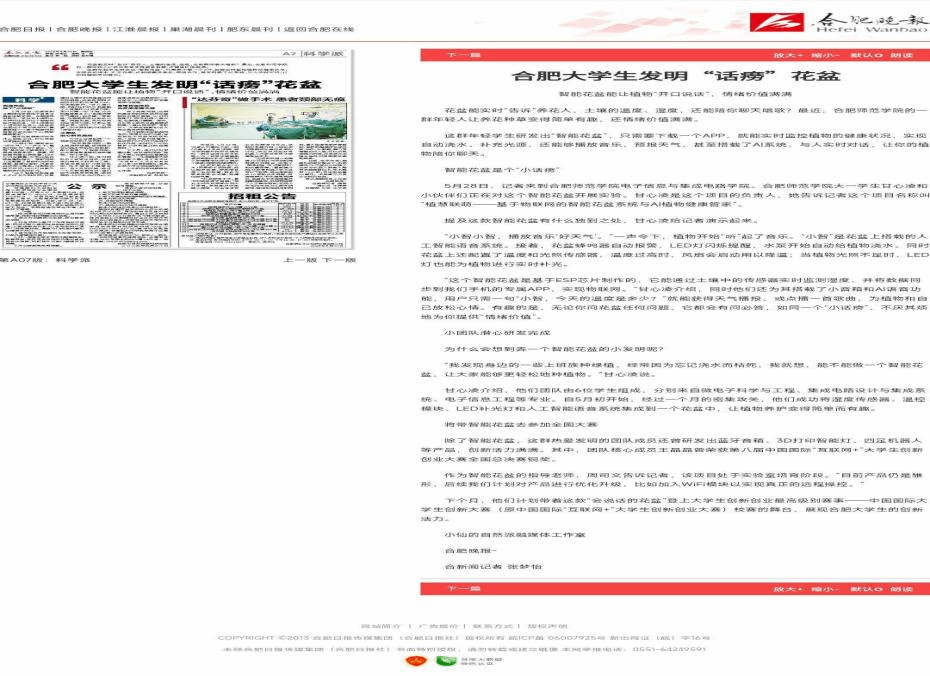 近日,电子信息与集成电路学院学生团队研发的“植慧联萌——基于物联网的智能花盆系统与AI植物健康管家”项目获得《合肥晚报》专题报道,展现了我校学子的创新活力与专业素养。