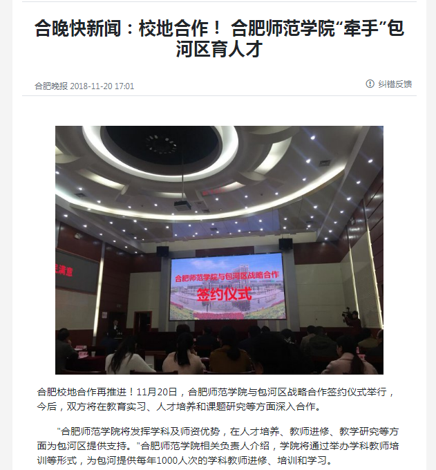 11月20日,合肥晚报以《校地合作! 388vip太阳集团“牵手”包河区育人才》为题对我院与包河区举行战略合作协议签订仪式进行了报道。