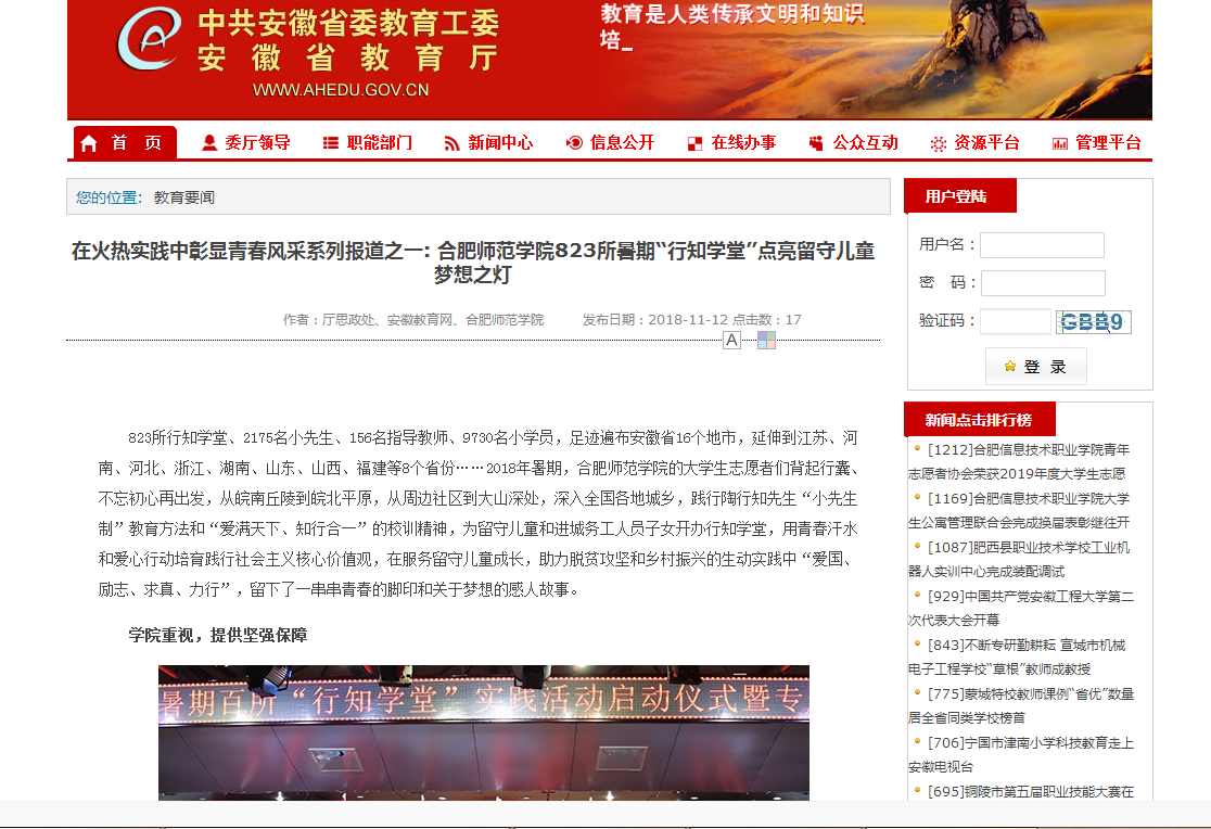 本网讯 11月12日,省委教育工委、省教育厅门户网站安徽教育网在“教育要闻”栏目头条以《在火热实践中彰显青春风采系列报道之一: 388vip太阳集团823所暑期“行知学堂”点亮留守儿童梦想之灯》为题,深度报道我院2018年暑期“行知学堂”实践活动。(院团委)