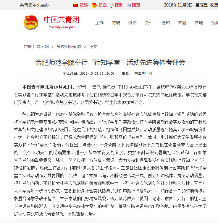 本网讯 10月9日,中国青年网对我院2018年暑期社会实践暨“行知学堂”活动先进集体考评会进行了报道。(院团委)