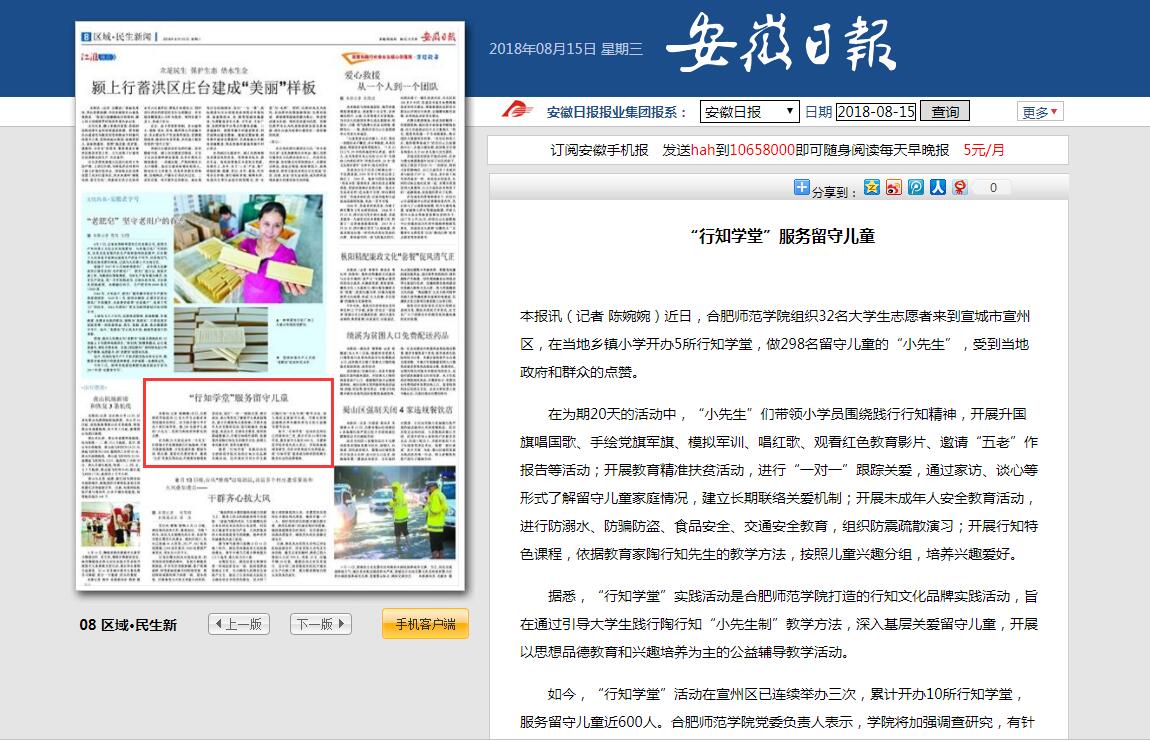 本网讯 8月15日,安徽日报在第8版“区域.民生新闻”以《“行知学堂”服务留守儿童》为题,对我院宣州区行知学堂进行了报道。(团委)