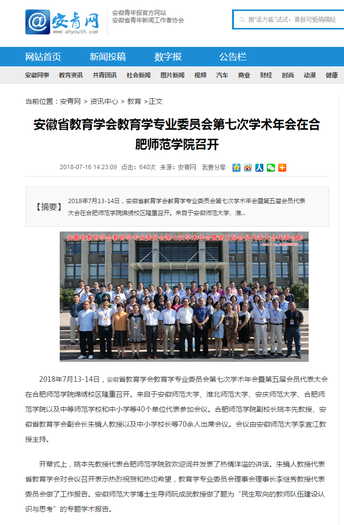 本网讯 7月13日至14日,安徽省教育学会教育学专业委员会第七次学术年会暨第五届会员代表大会在我院锦绣校区召开。安青网对此进行了报道。(教师教育学院)
