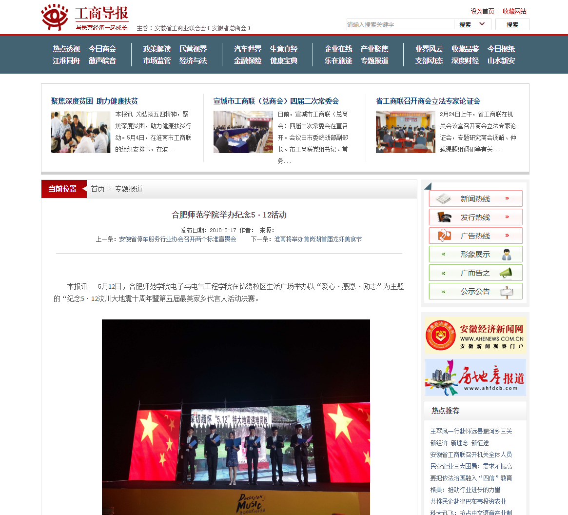 本网讯 5月17日,安徽工商导报报道了我校学生处和校团委主办、电子信息与电气工程学院分团委承办的“纪念5·12汶川大地震”十周年暨第五届最美代言人决赛。(电子信息与电气工程学院:周玉)